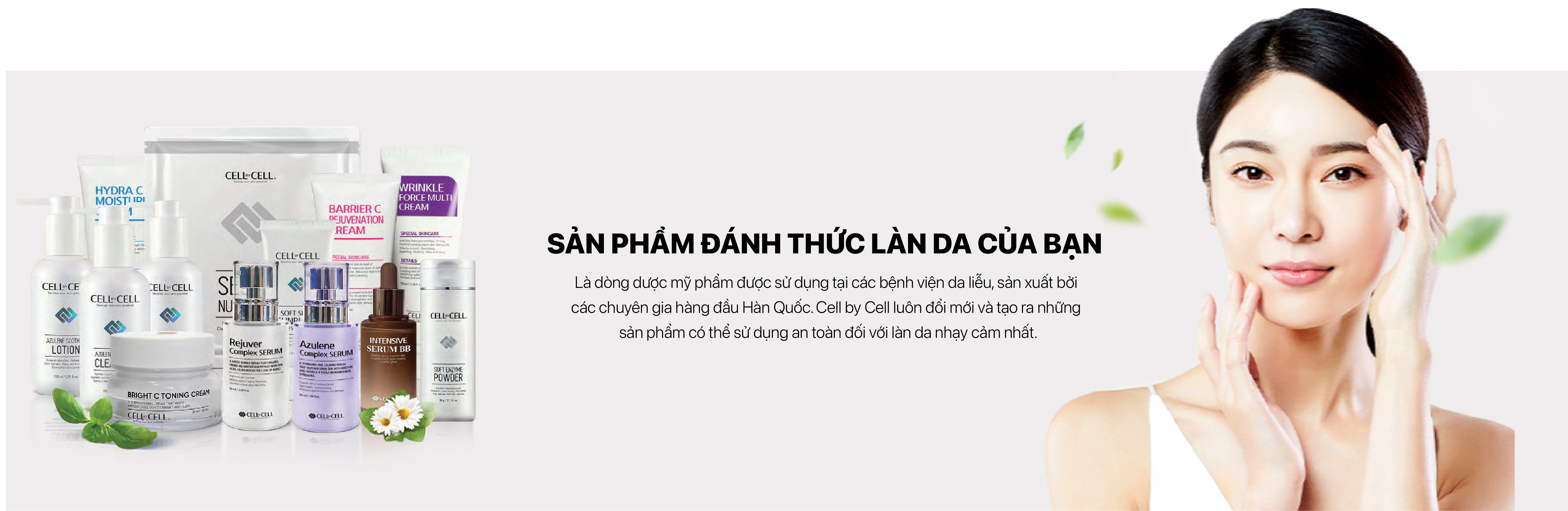Cell by Cell là thương hiệu Dược mỹ phẩm thiên nhiên nổi tiếng và uy tín tại Hàn Quốc, được sản xuất dựa trên những nghiên cứu về công nghệ tế bào da. Là Dược mỹ phẩm chuyên dùng trong các bệnh viện da liễu và spa, thẩm mỹ lớn tại Hàn Quốc cũng như nhiều nước trên thế giới, cực kì lành tính, không gây kích ứng, giúp tái tạo và nuôi dưỡng cho làn da khỏe mạnh từ sâu bên trong, đặc biệt an toàn và hiệu quả với cả những làn da “khó tính, nhạy cảm” nhất như: da mụn, da tổn thương sau điều trị…